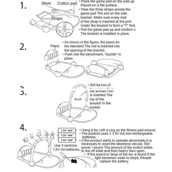 Sensory Stimulation:Features music, lighting, and a 4-key piano with lights on the feet, allowing the child to enjoy music by pressing with their feet and strengthening their leg muscles. The gym is 100% safe and non-toxic for your child, suitable for babies from birth to 36 months old.