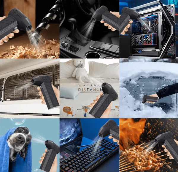Mini Jet Fan Blower – A compact, handheld electric blower with powerful airflow and a built‑in LED light, ideal for dust removal, BBQ fire starting, and outdoor combustion assistance.