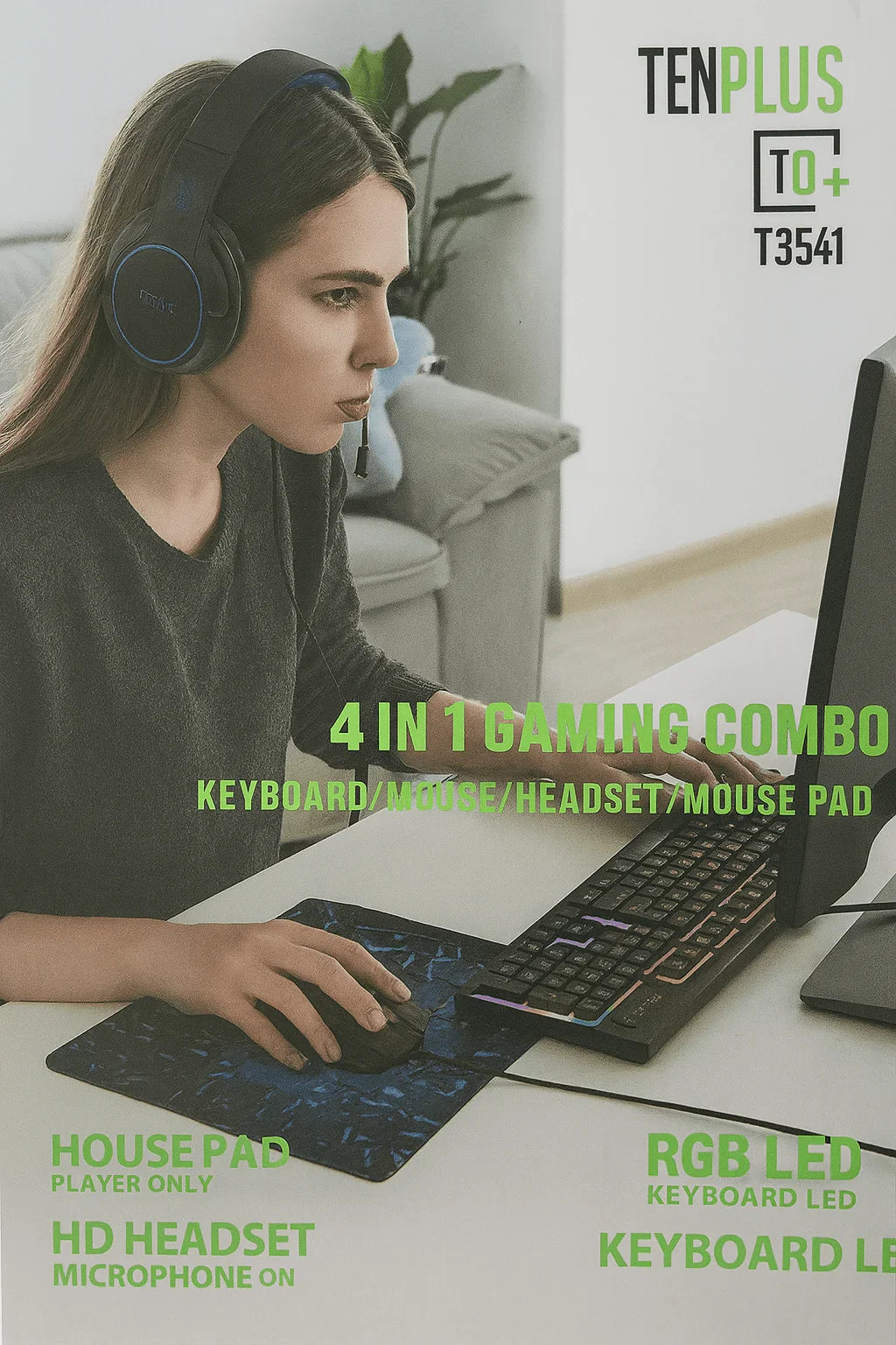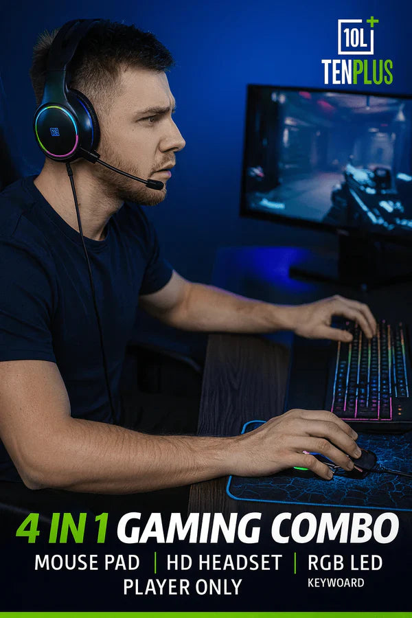 TENPLUS 4-in-1 Gaming Combo– A complete gaming accessory set featuring an RGB LED keyboard, optical mouse, HD headset with mic, and a textured mouse pad, all designed for immersive play.